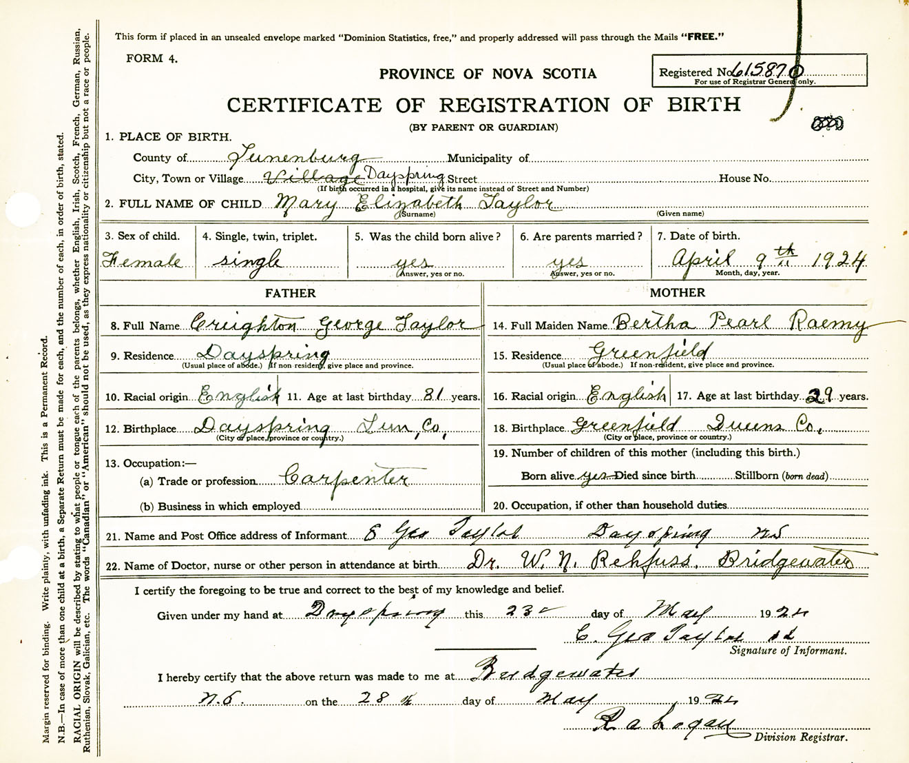 Female Birth Registration: Year: 1924 number: 61500870