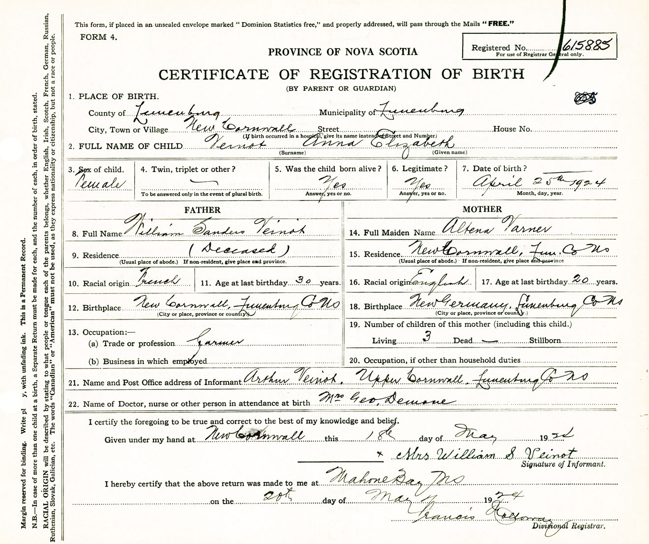 Female Birth Registration: Year: 1924 number: 61500885