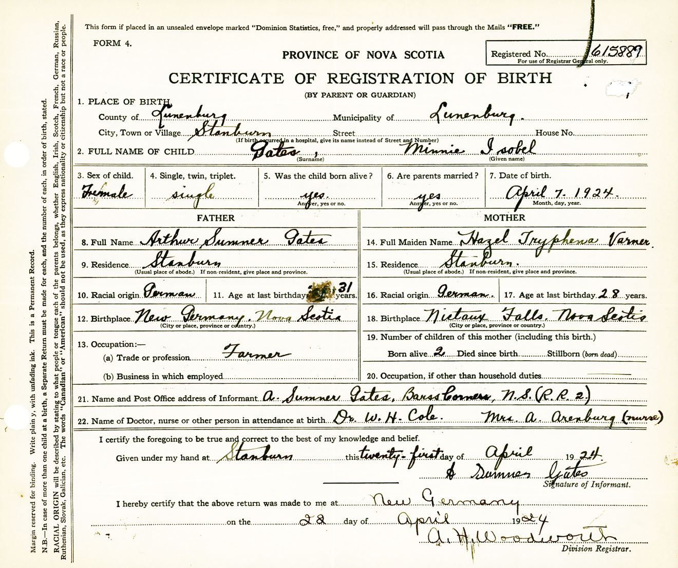 Female Birth Registration: Year: 1924 number: 61500889