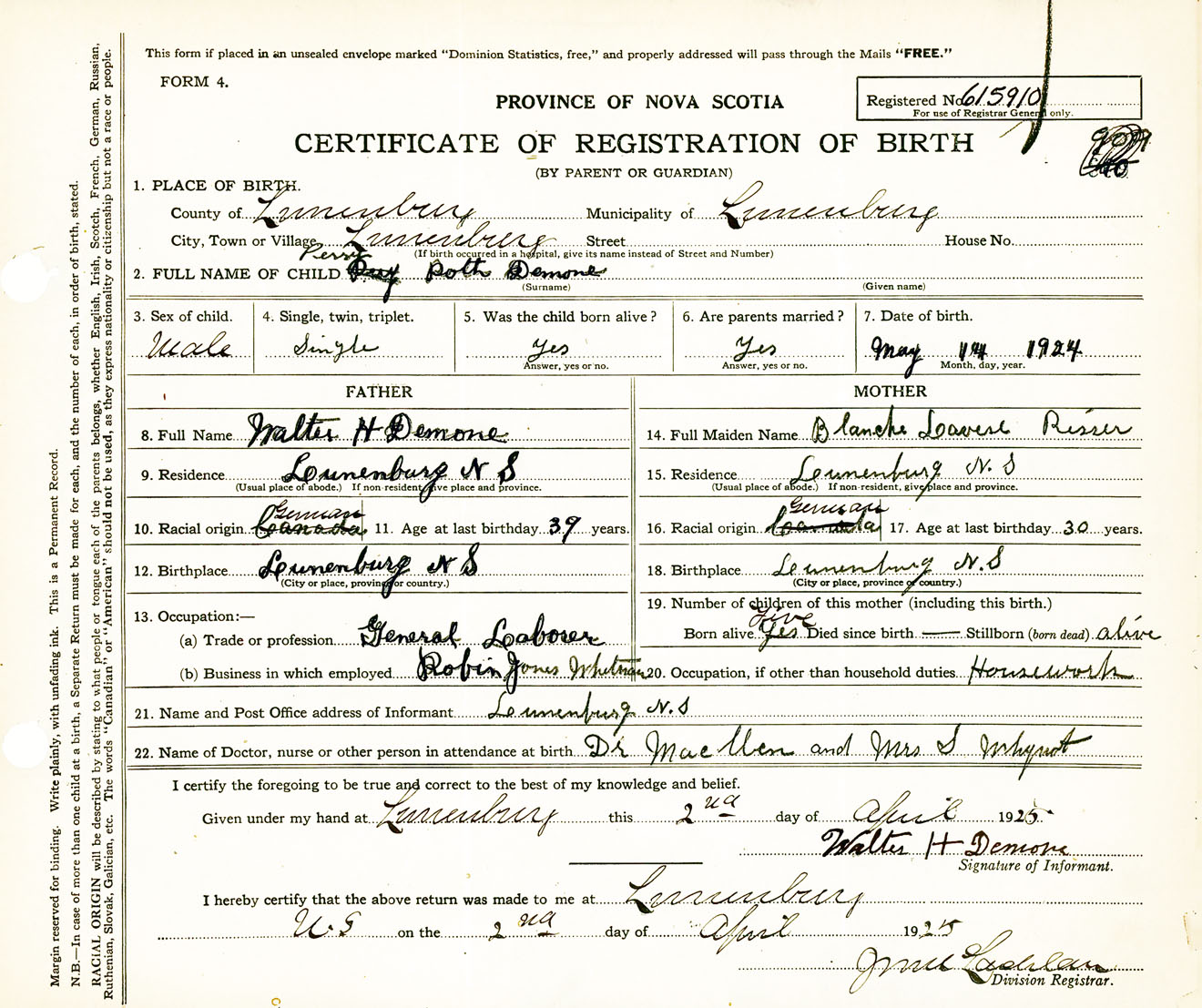 Male Birth Registration: Year: 1924 number: 61500910