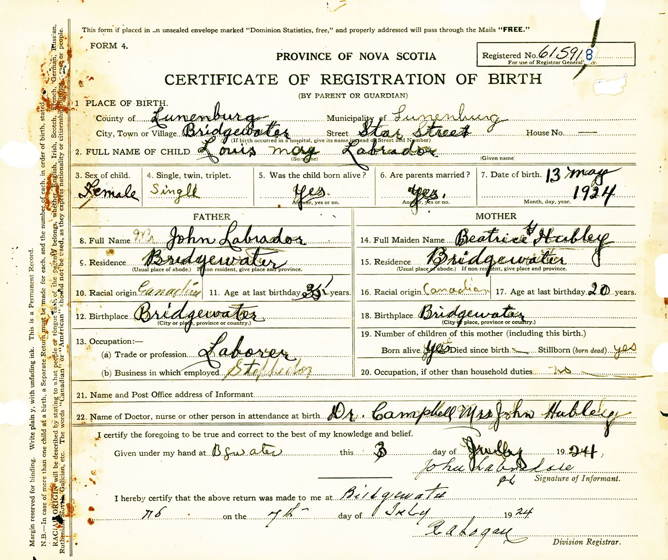 Female Birth Registration: Year: 1924 number: 61500918