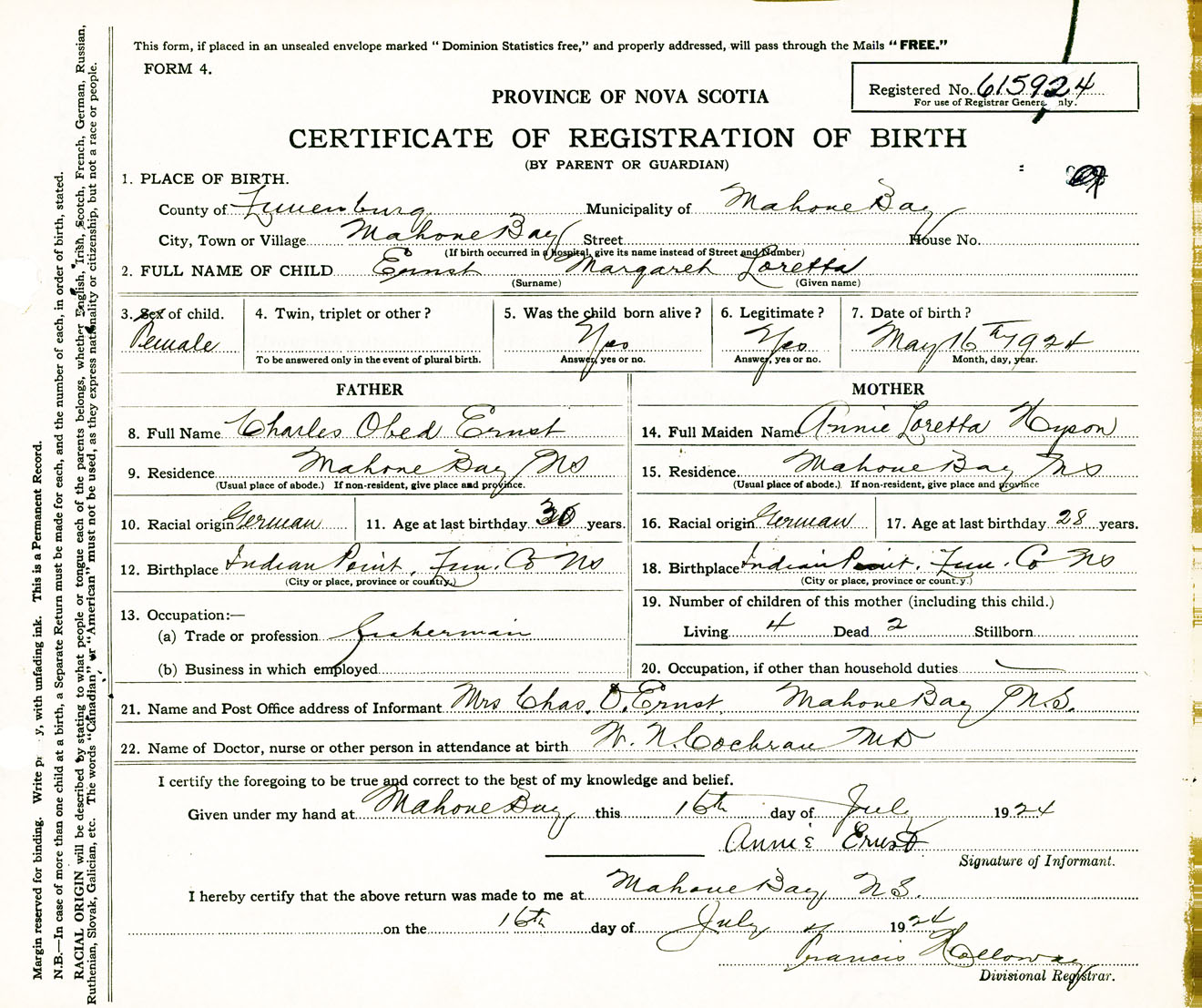 Female Birth Registration: Year: 1924 number: 61500924