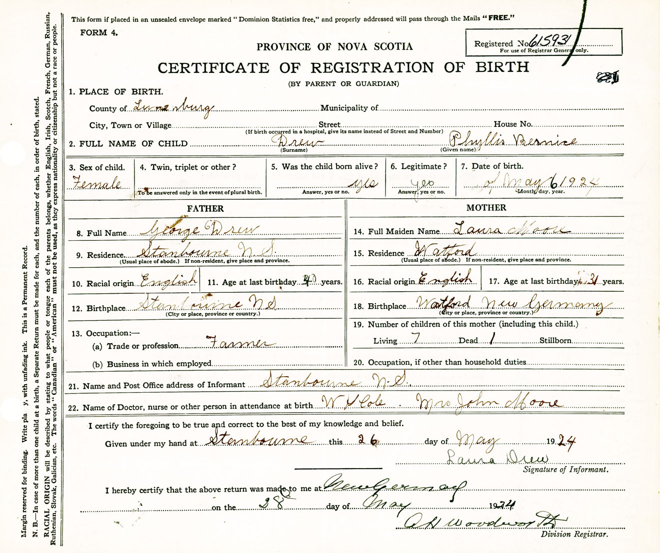 Female Birth Registration: Year: 1924 number: 61500931