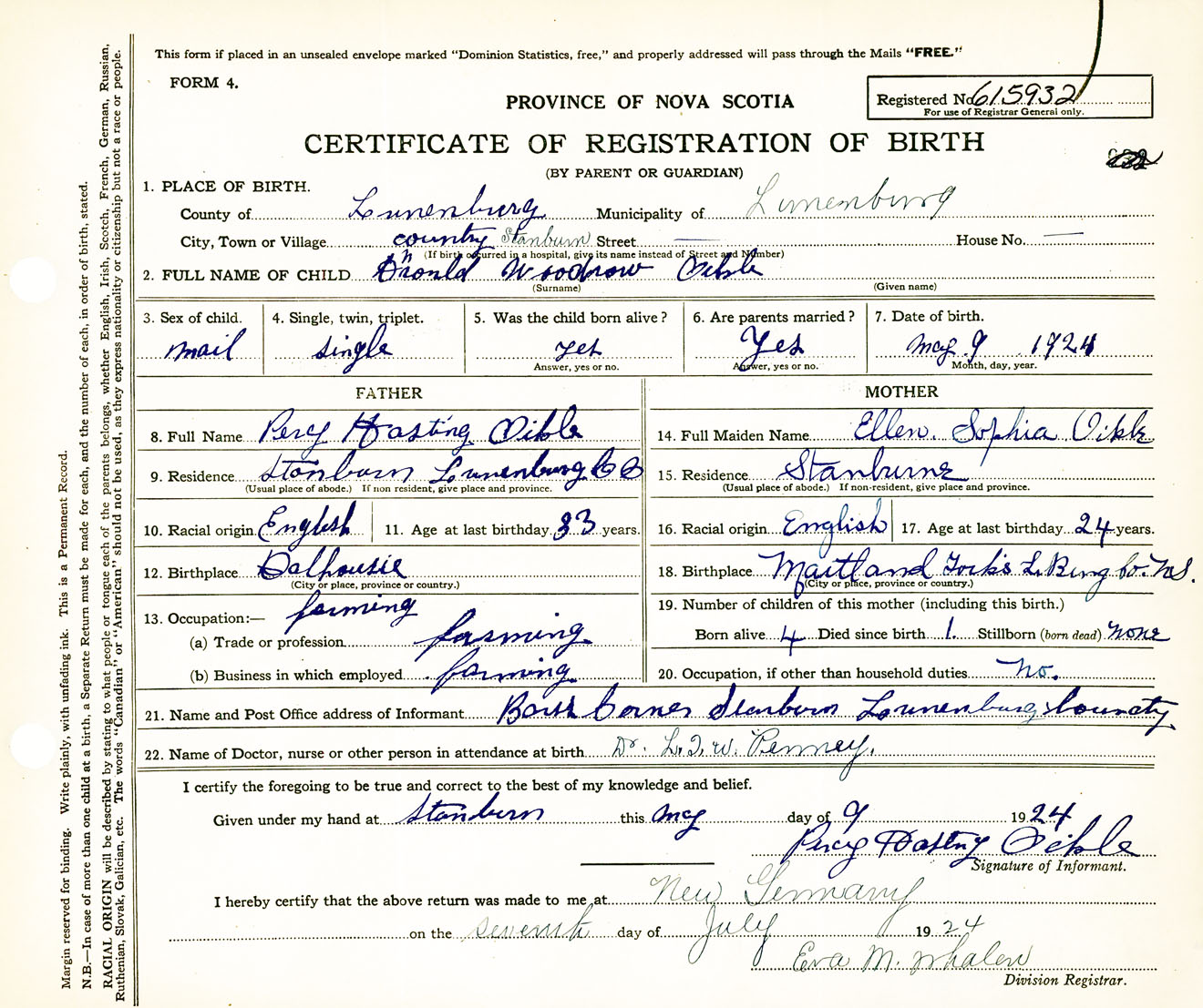Male Birth Registration: Year: 1924 number: 61500932