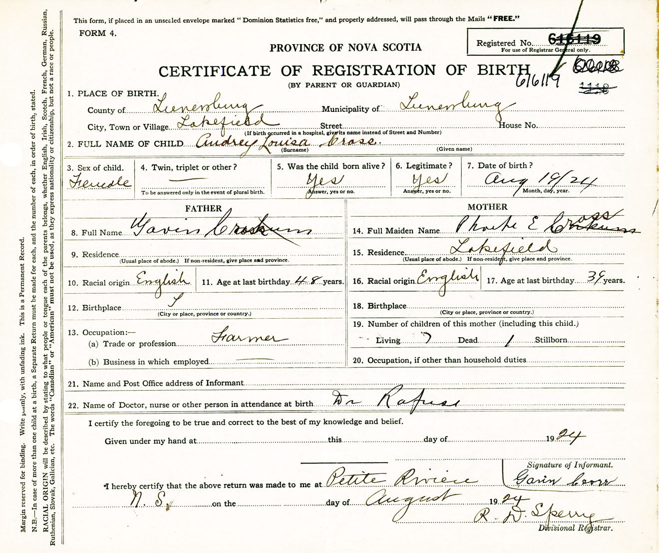 Female Birth Registration: Year: 1924 number: 61600119
