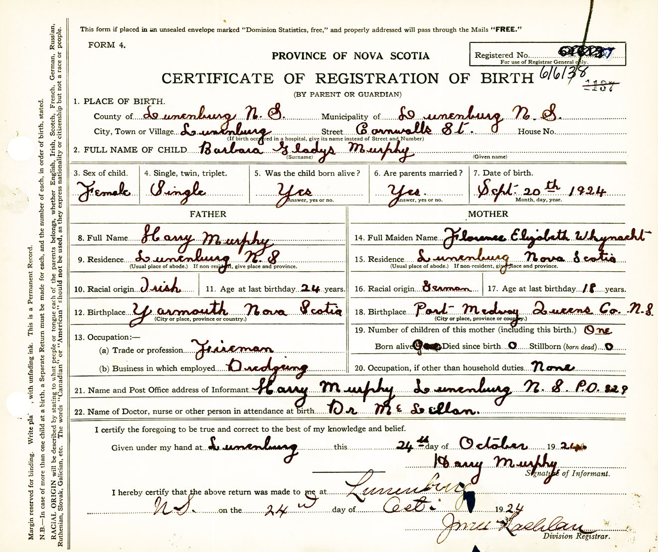 Female Birth Registration: Year: 1924 number: 61600138