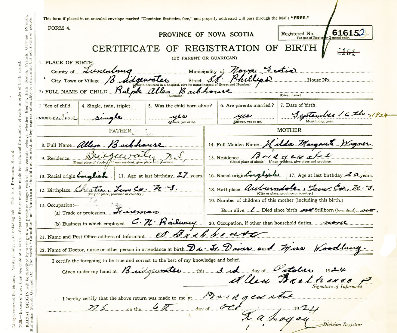 Male Birth Registration: Year: 1924 number: 61600152