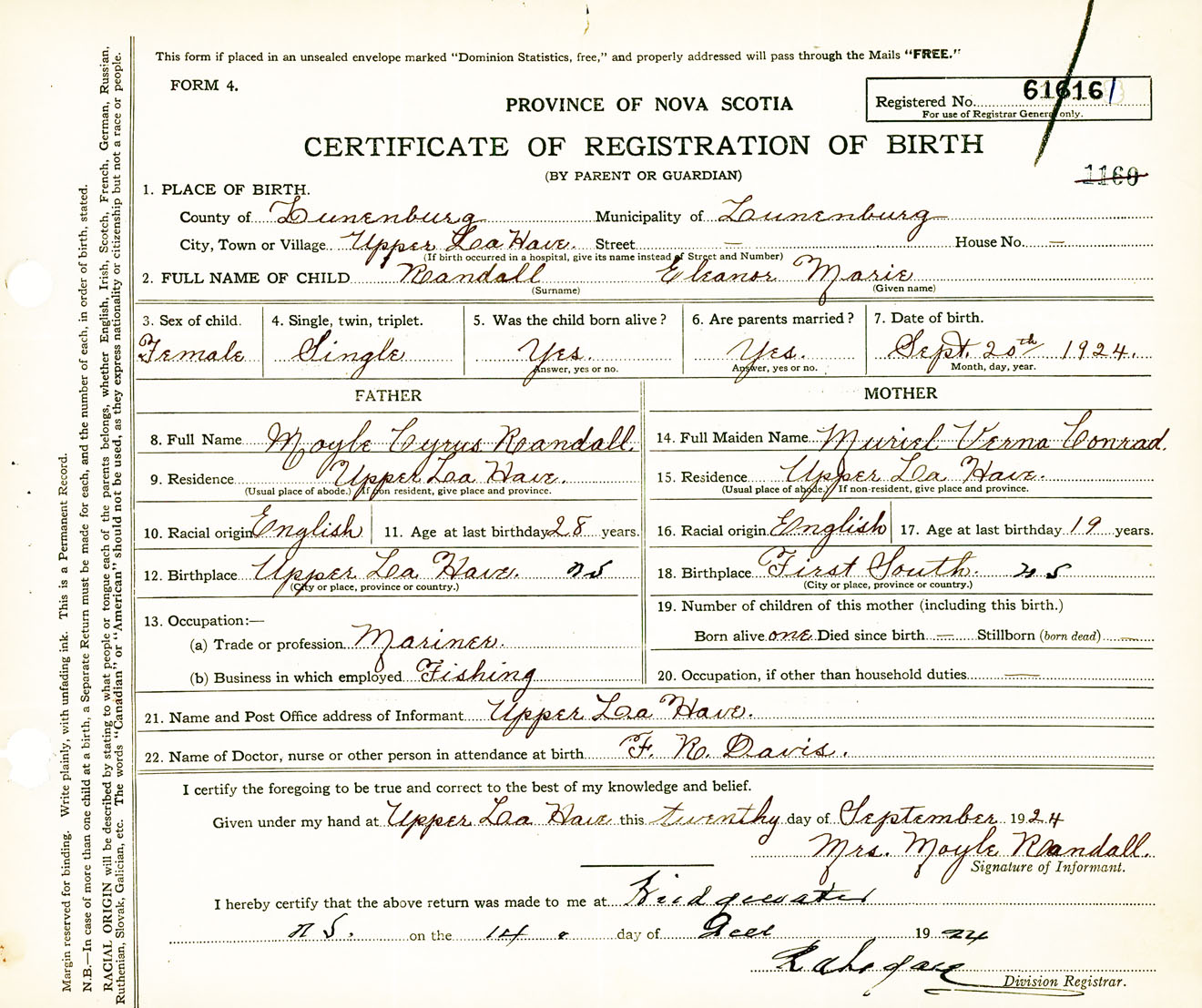 Female Birth Registration: Year: 1924 number: 61600161