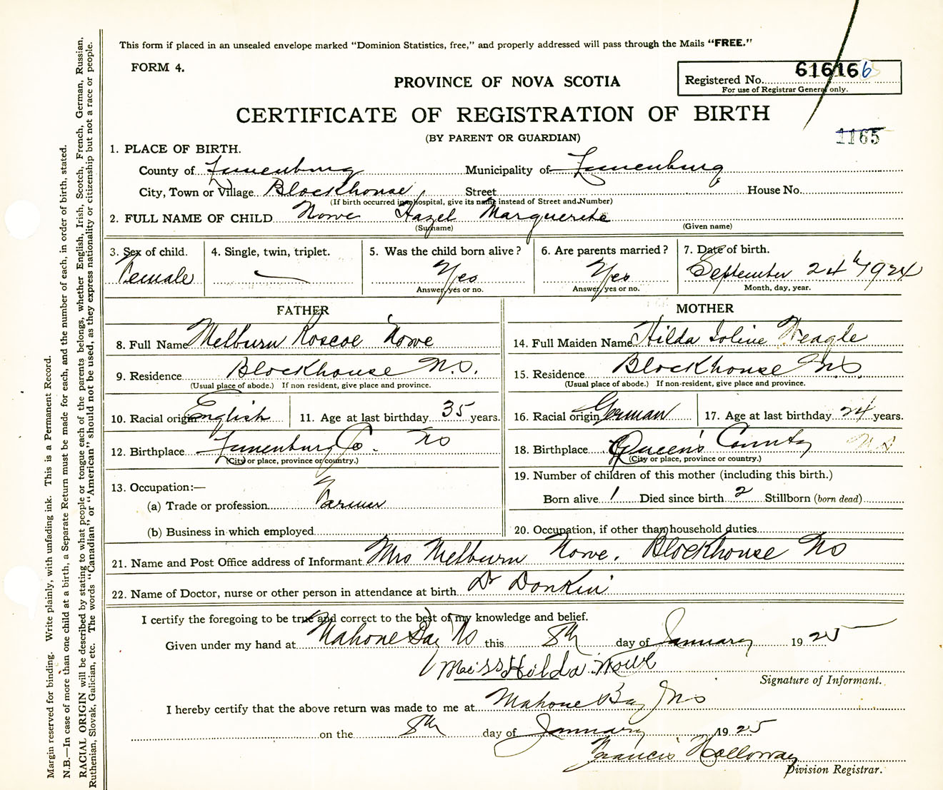 Female Birth Registration: Year: 1924 number: 61600166