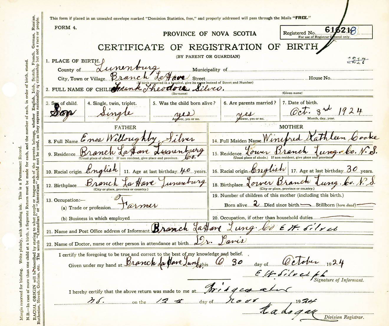 Male Birth Registration: Year: 1924 number: 61600218