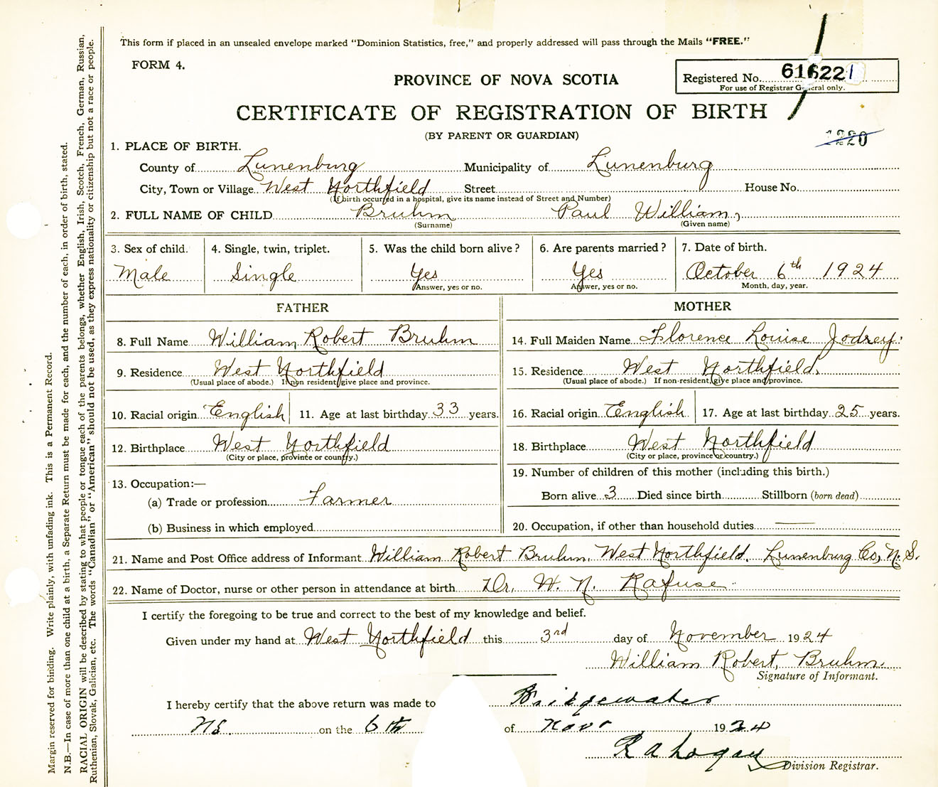 Male Birth Registration: Year: 1924 number: 61600221
