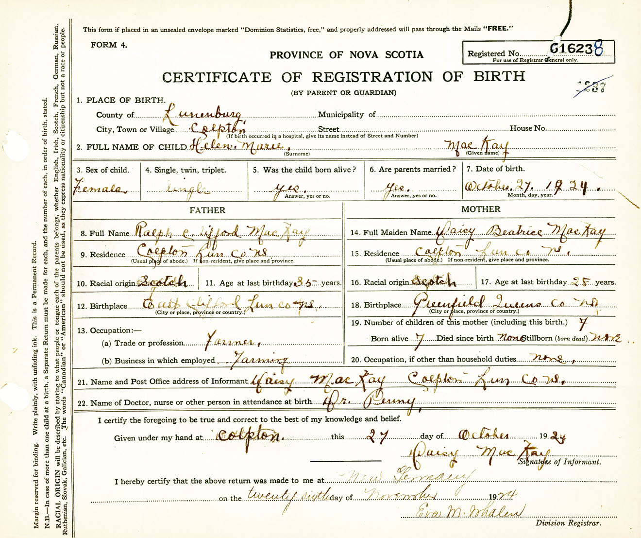 Female Birth Registration: Year: 1924 number: 61600238