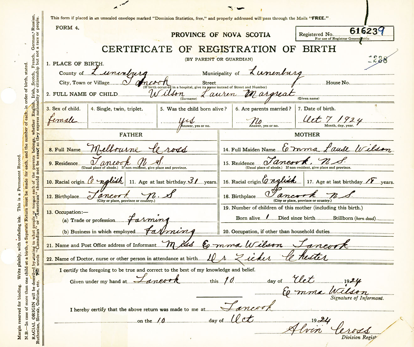 Female Birth Registration: Year: 1924 number: 61600239