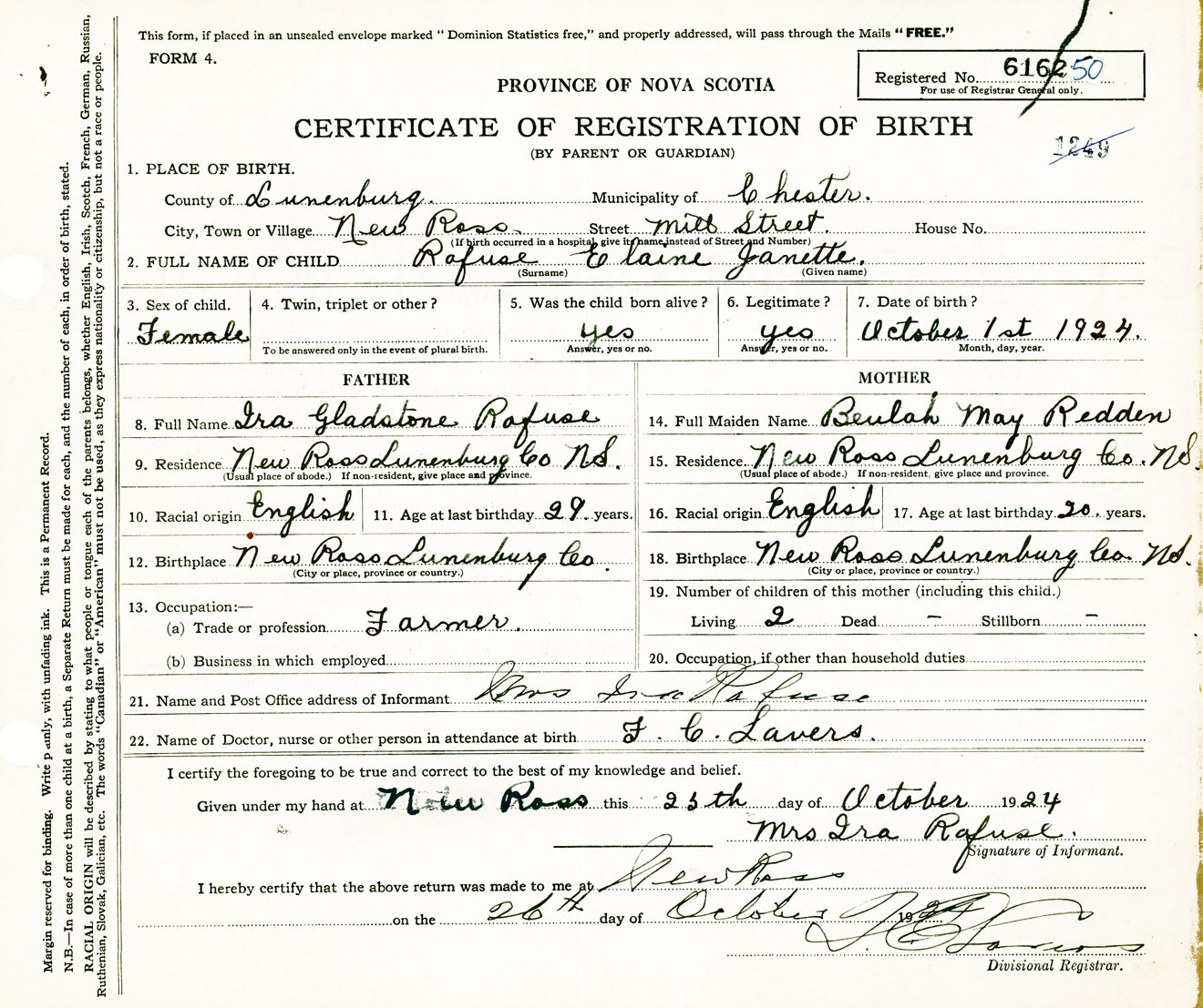 Female Birth Registration: Year: 1924 number: 61600250
