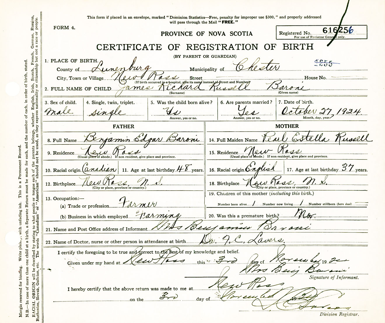 Male Birth Registration: Year: 1924 number: 61600256