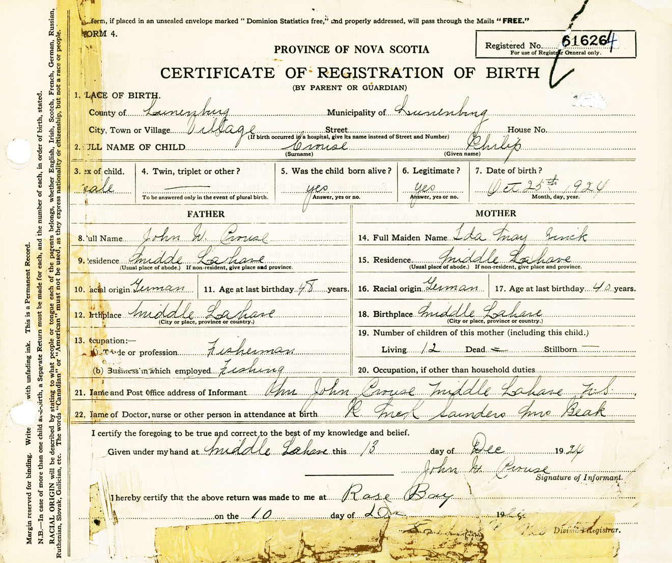 Male Birth Registration: Year: 1924 number: 61600264