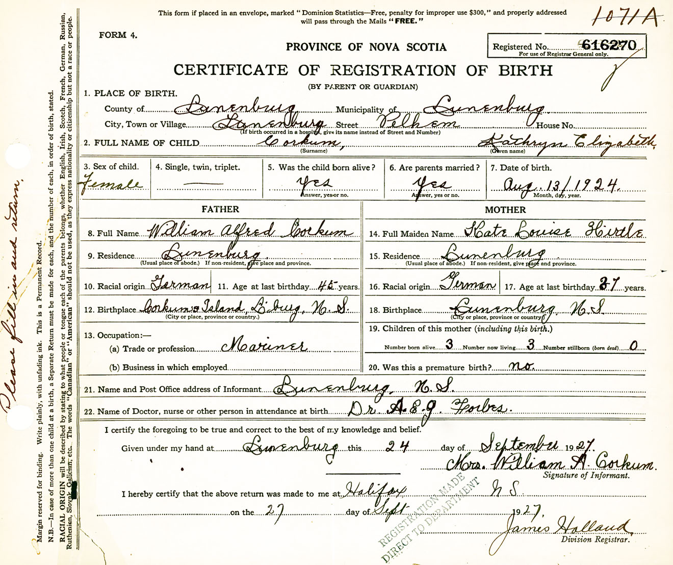 Female Birth Registration: Year: 1924 number: 61600270