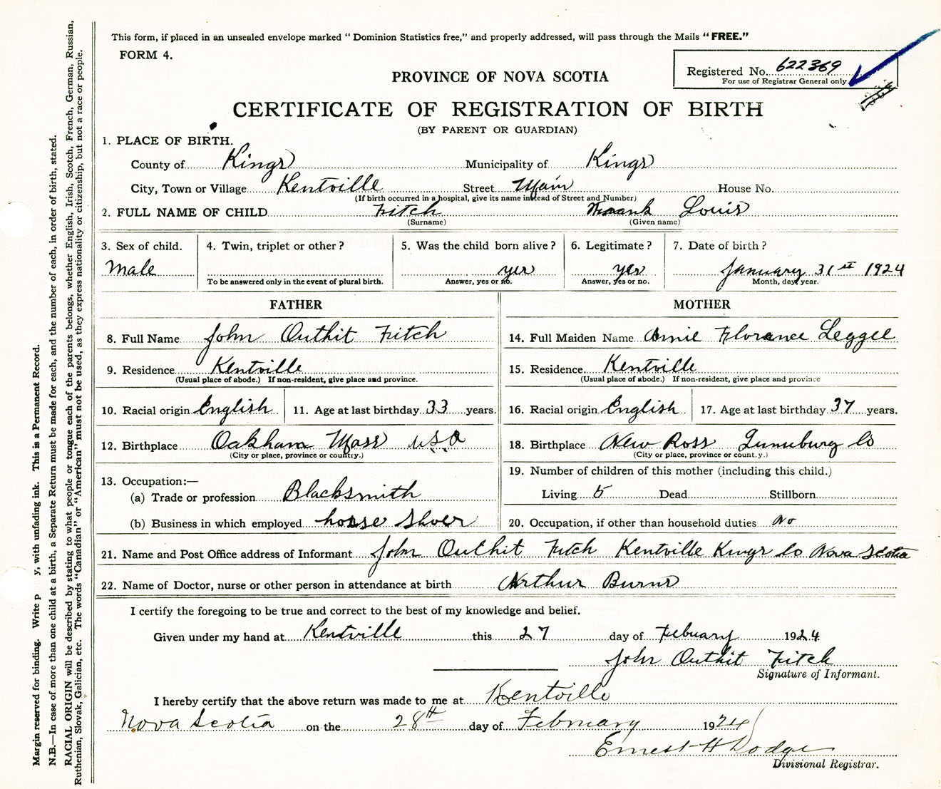 Male Birth Registration: Year: 1924 number: 62200369