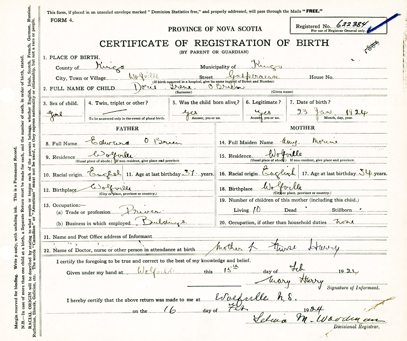 Female Birth Registration: Year: 1924 number: 62200384