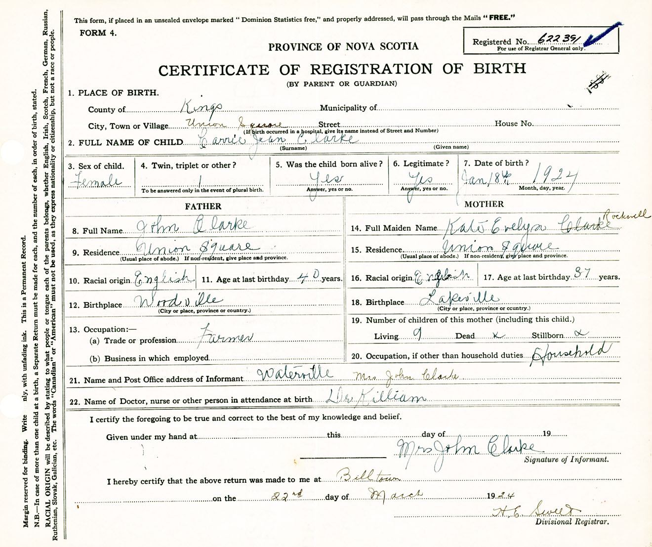 Female Birth Registration: Year: 1924 number: 62200391