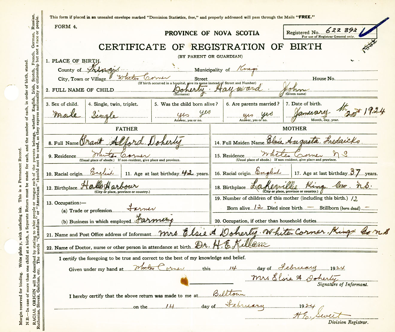 Male Birth Registration: Year: 1924 number: 62200392