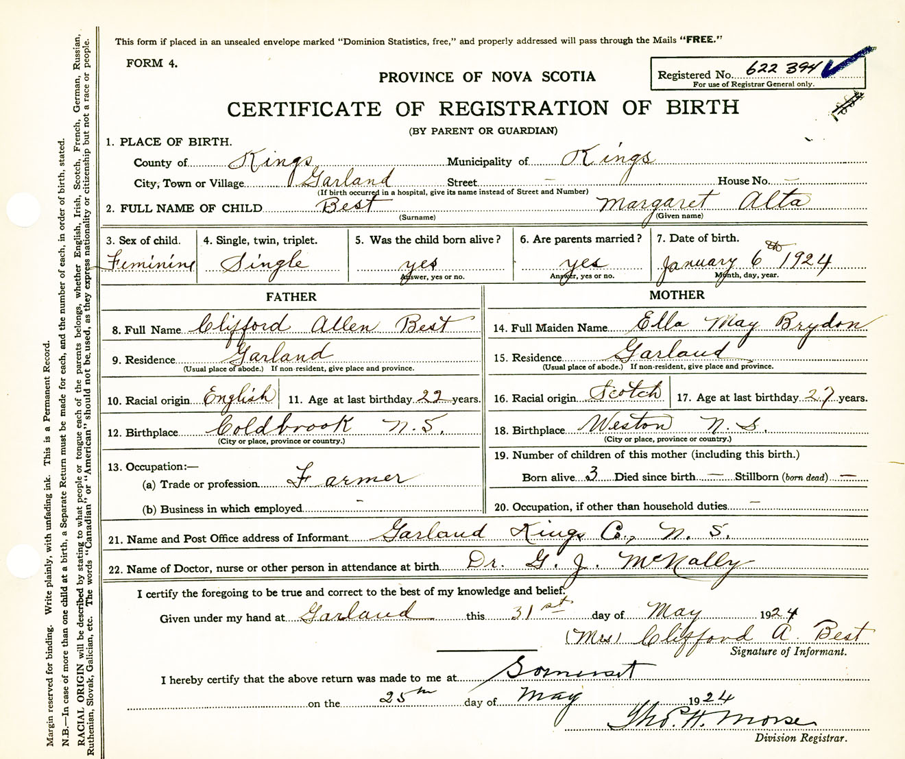 Female Birth Registration: Year: 1924 number: 62200394