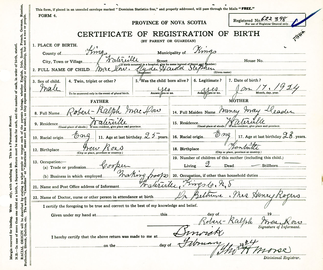 Male Birth Registration: Year: 1924 number: 62200398