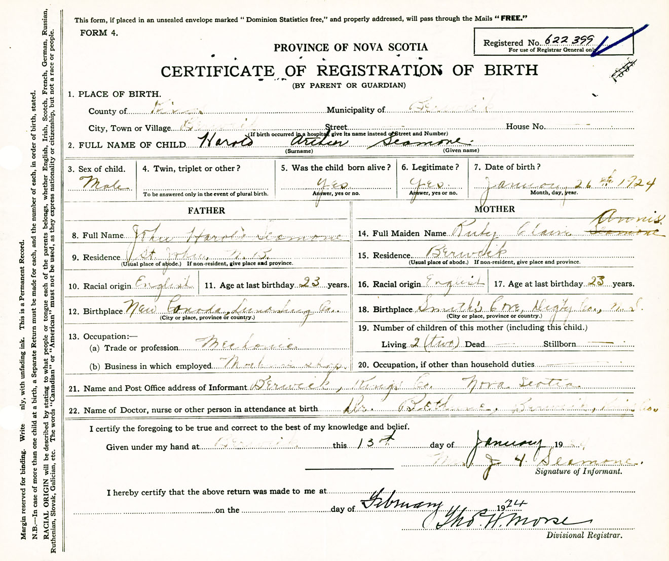 Male Birth Registration: Year: 1924 number: 62200399