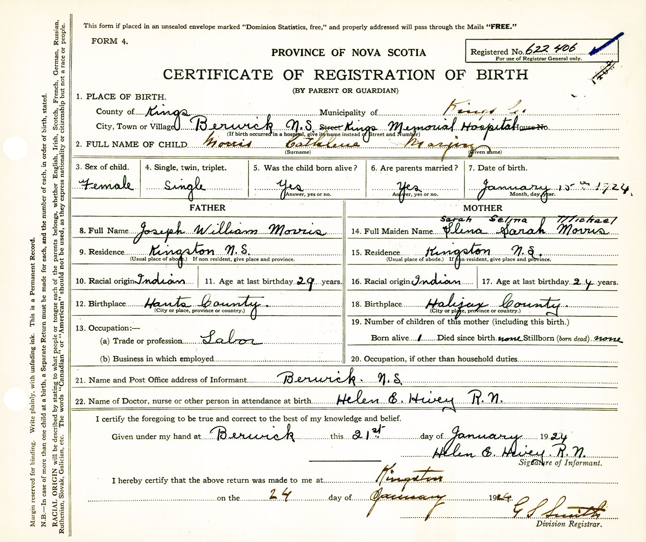 Female Birth Registration: Year: 1924 number: 62200406