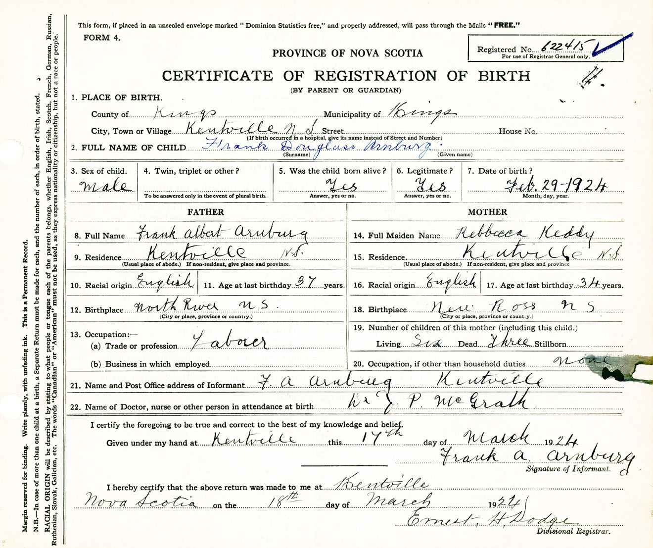 Male Birth Registration: Year: 1924 number: 62200415