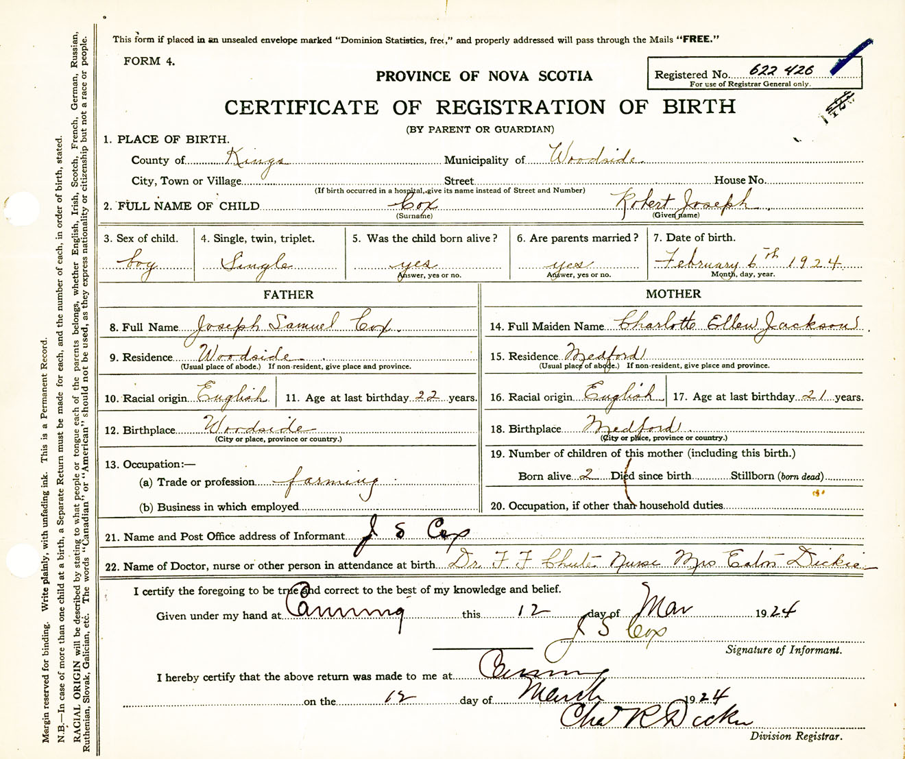 Male Birth Registration: Year: 1924 number: 62200426
