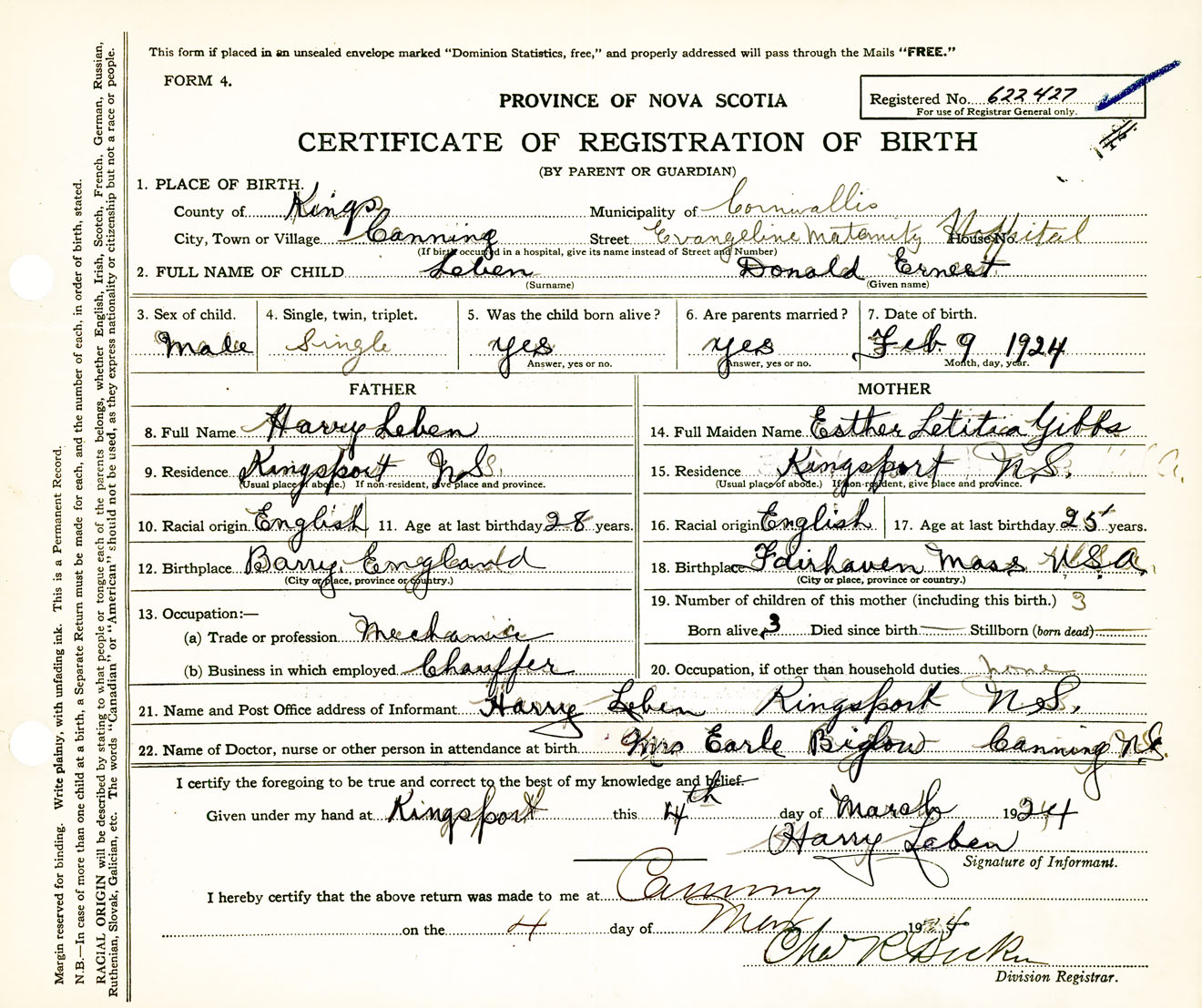 Male Birth Registration: Year: 1924 number: 62200427