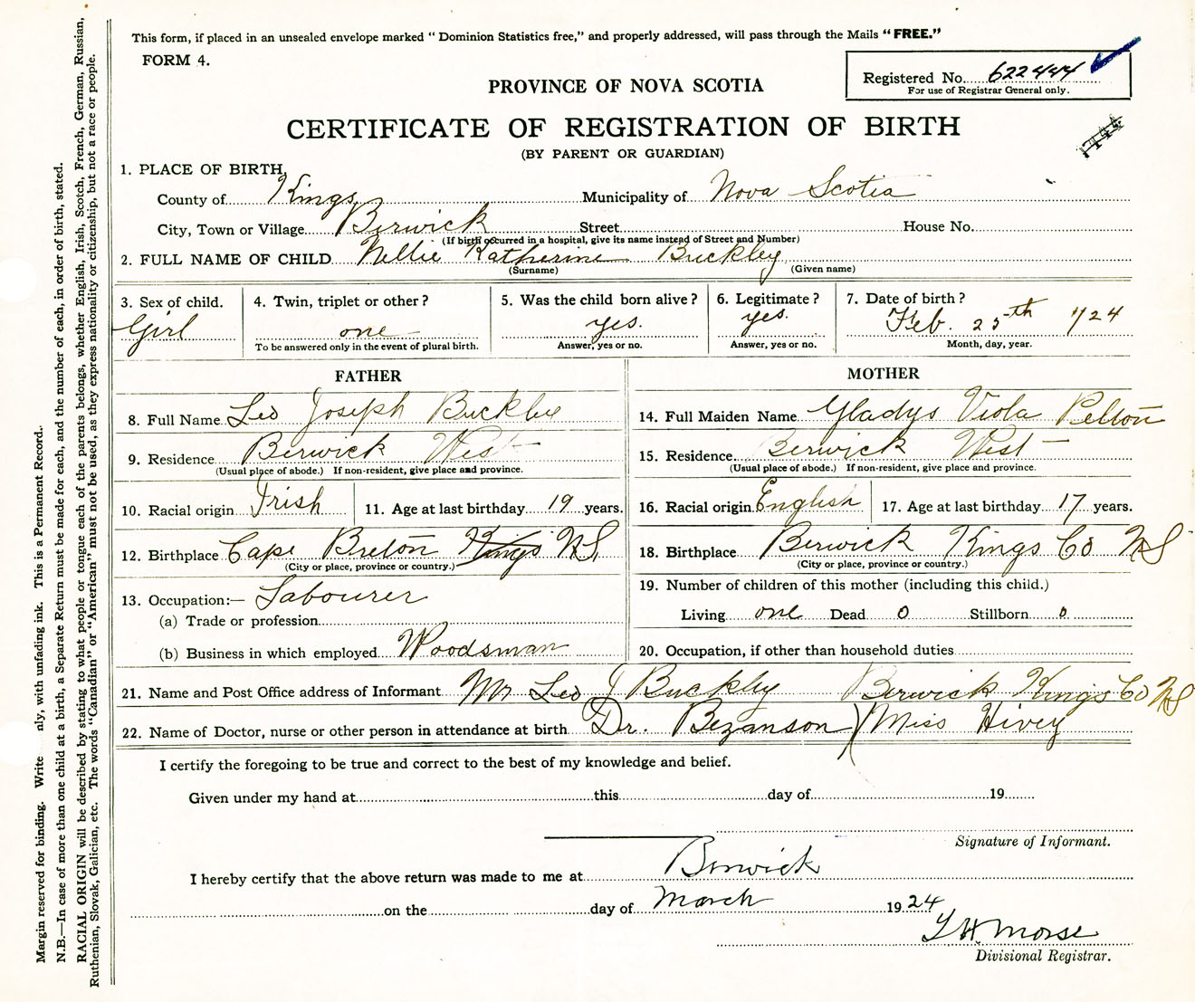 Female Birth Registration: Year: 1924 number: 62200444