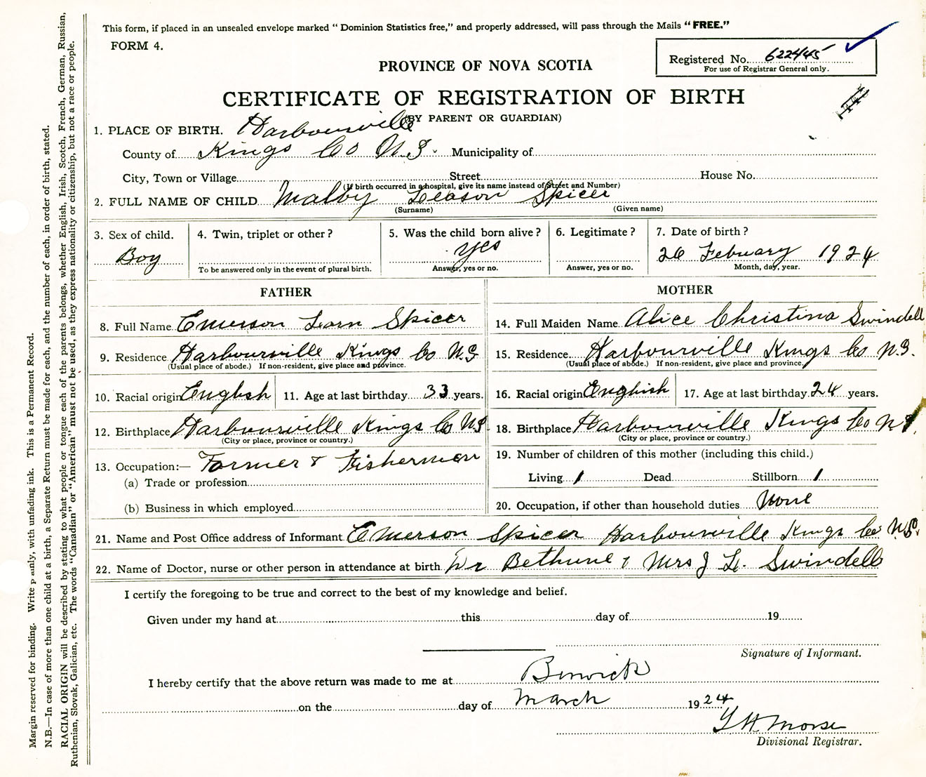 Male Birth Registration: Year: 1924 number: 62200445