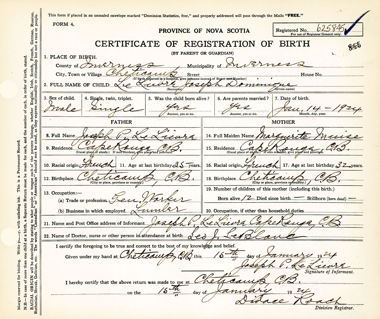 Male Birth Registration: Year: 1924 number: 62500845