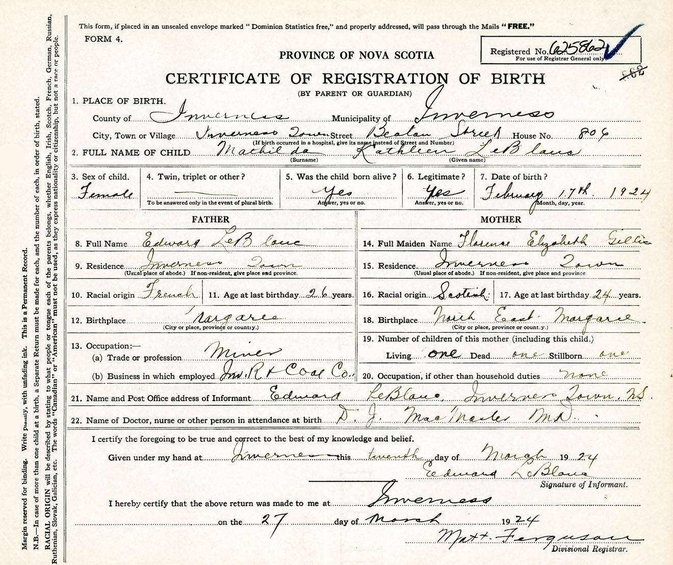 Female Birth Registration: Year: 1924 number: 62500862