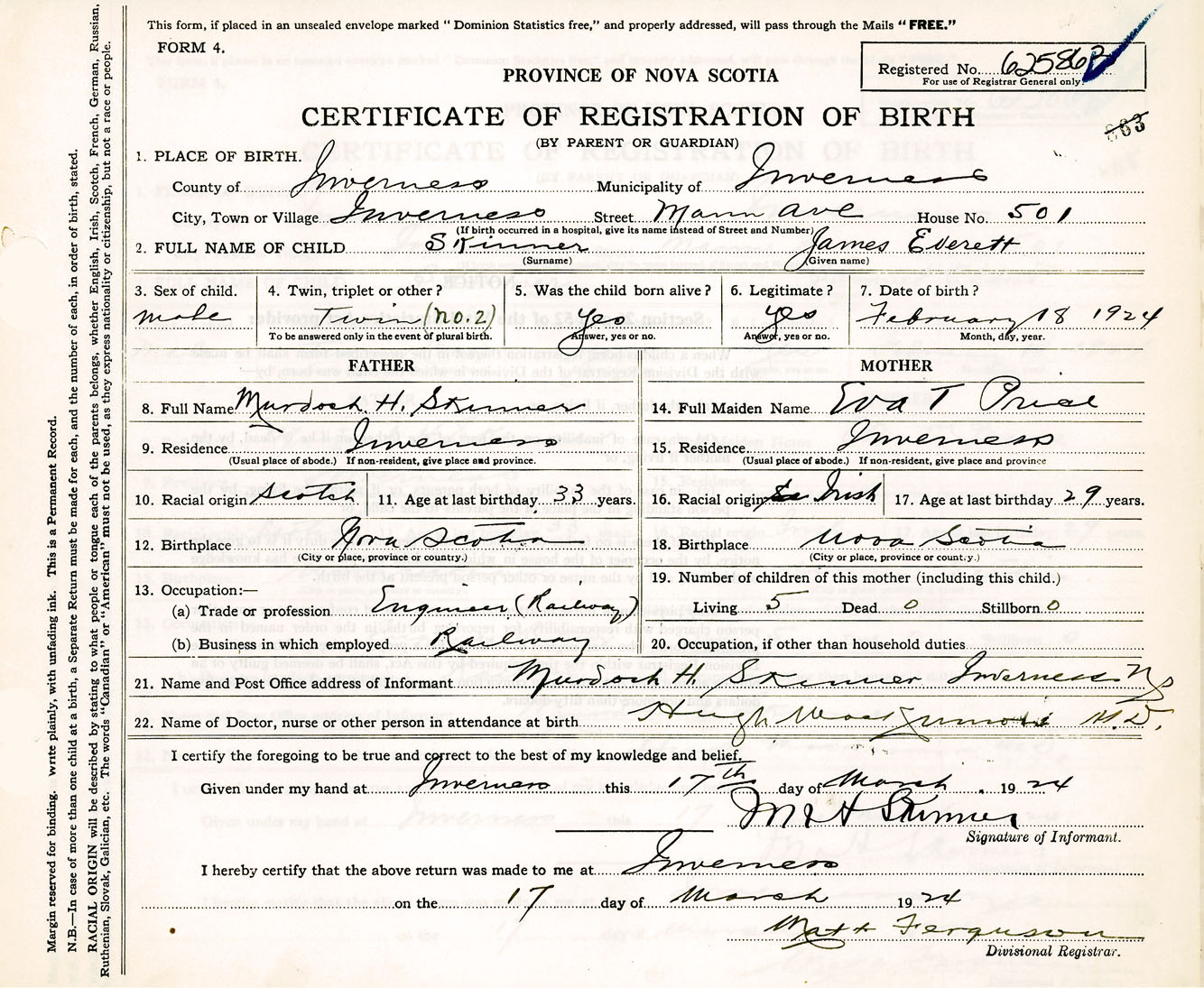 Male Birth Registration: Year: 1924 number: 62500863