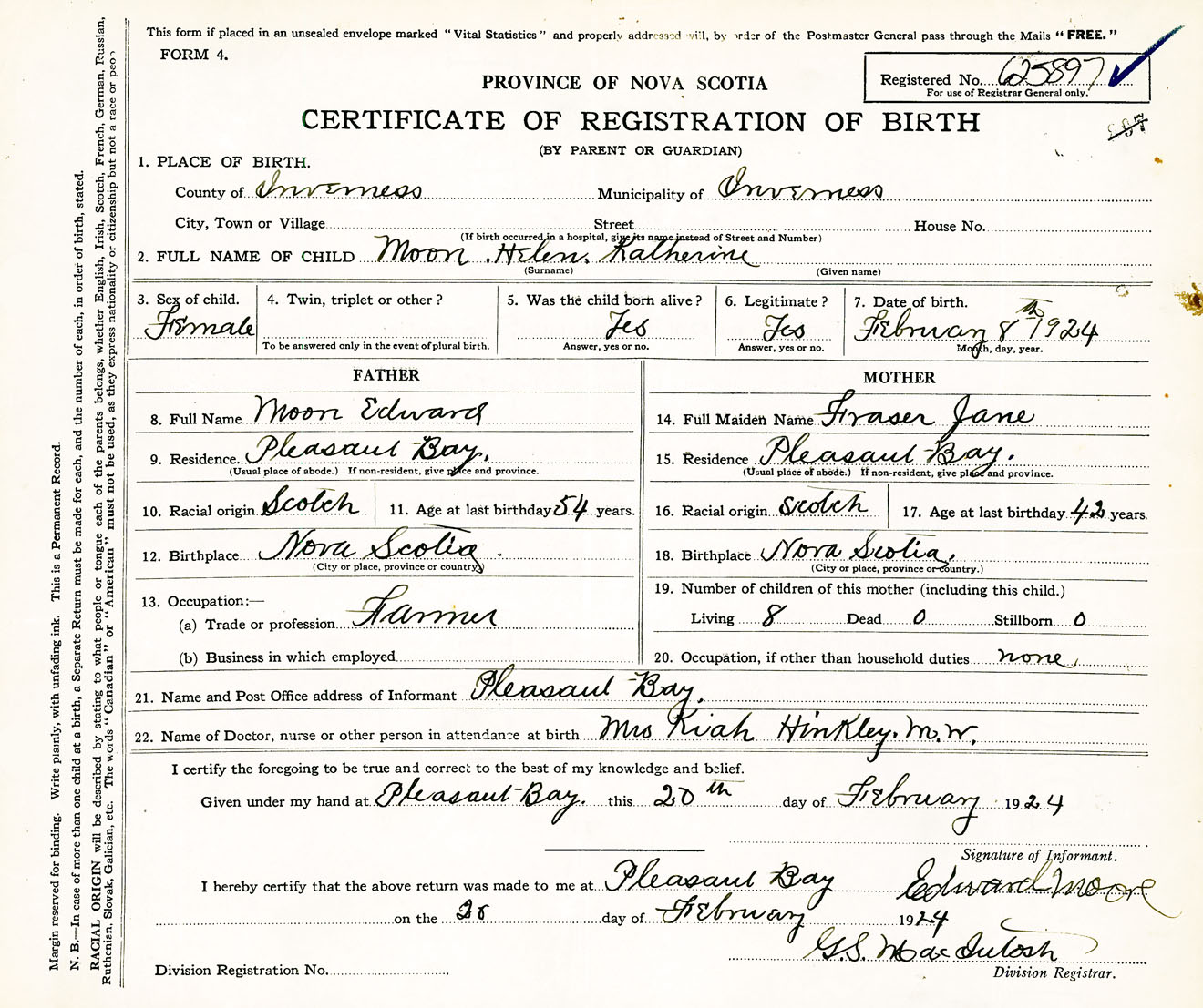 Female Birth Registration: Year: 1924 number: 62500897