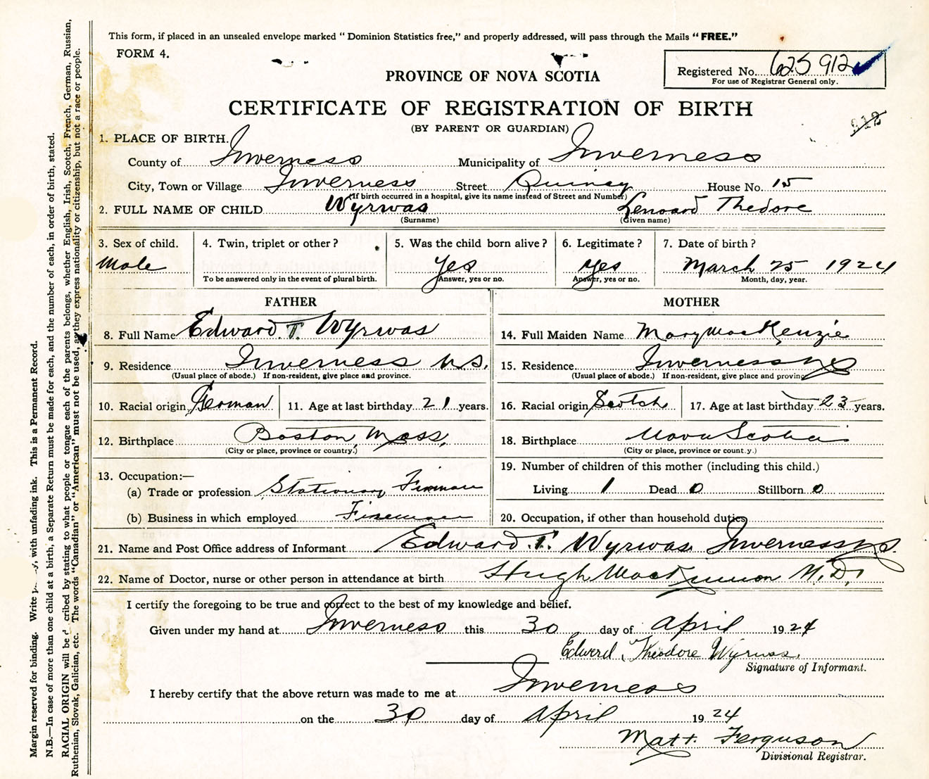 Male Birth Registration: Year: 1924 number: 62500912