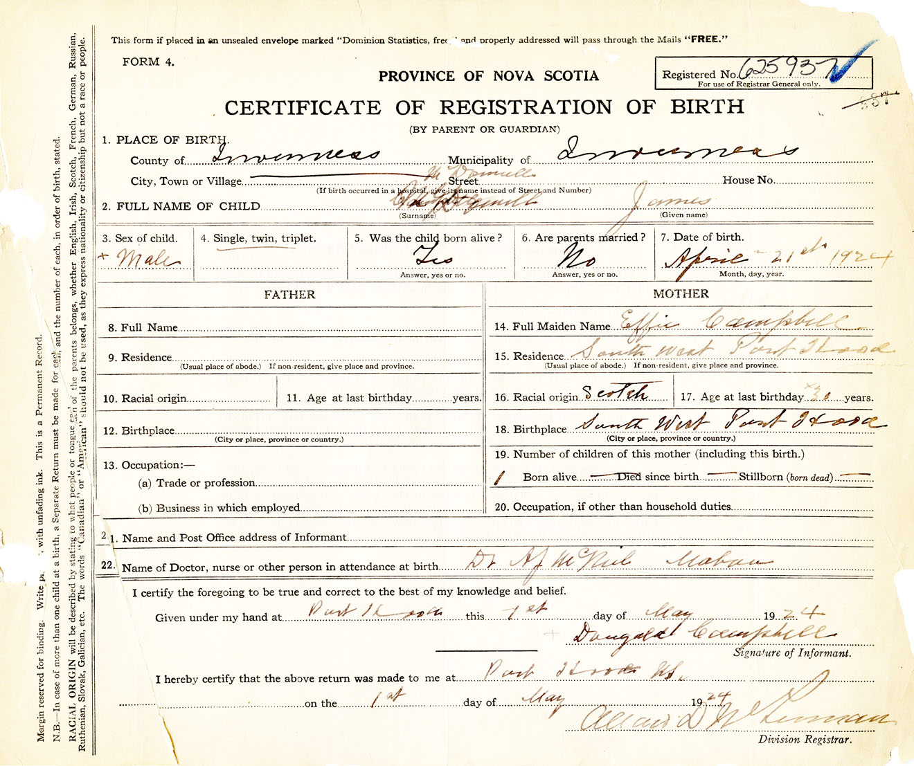 Male Birth Registration: Year: 1924 number: 62500937