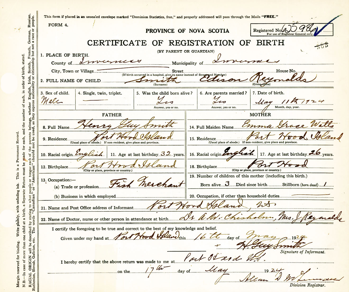 Male Birth Registration: Year: 1924 number: 62500986