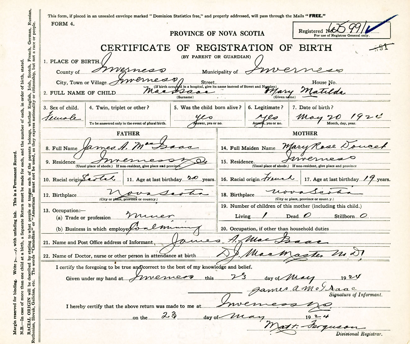Female Birth Registration: Year: 1924 number: 62500991