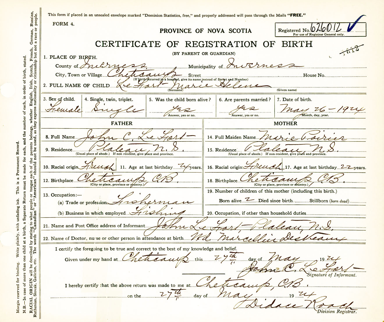Female Birth Registration: Year: 1924 number: 62600012