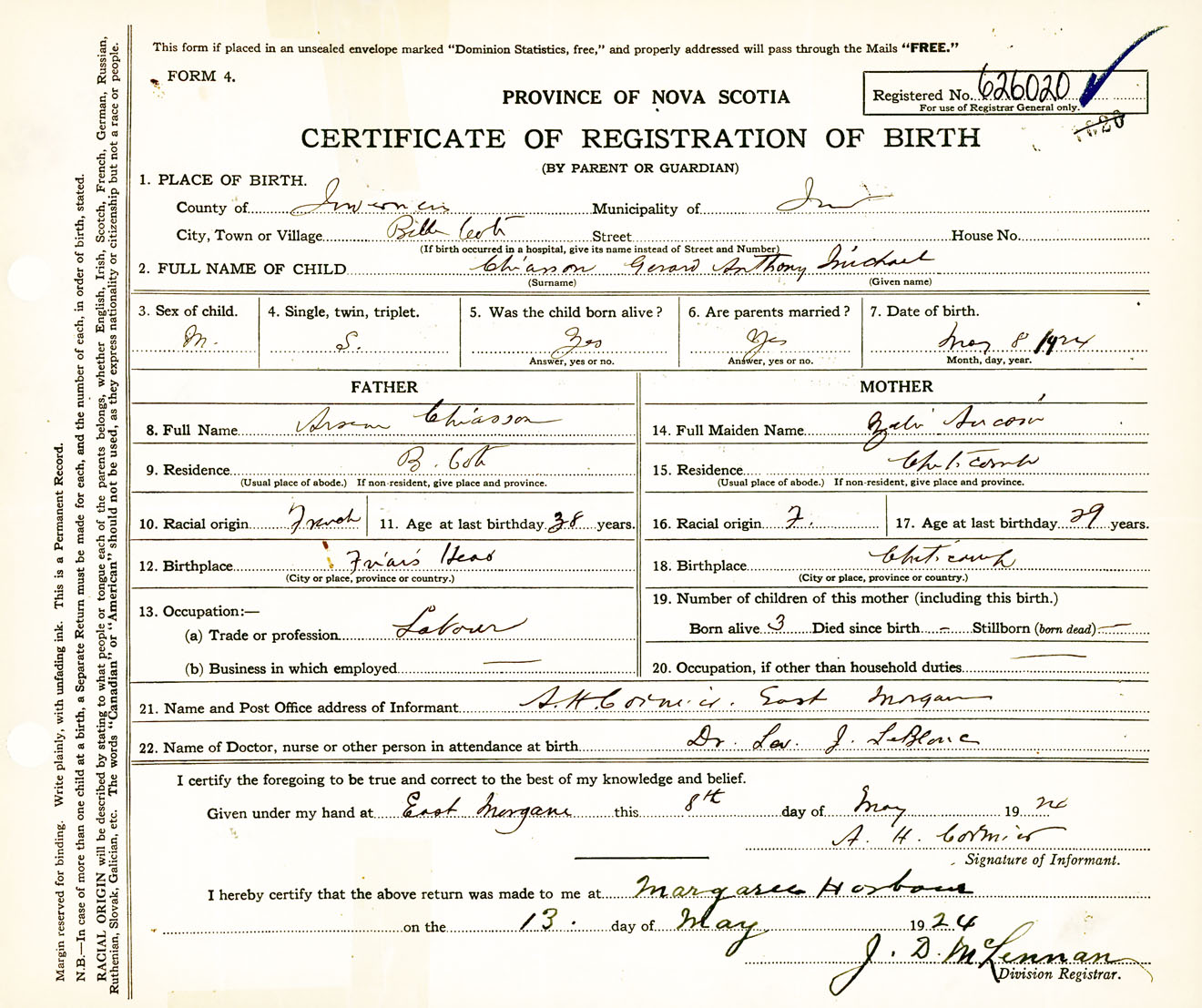 Male Birth Registration: Year: 1924 number: 62600020