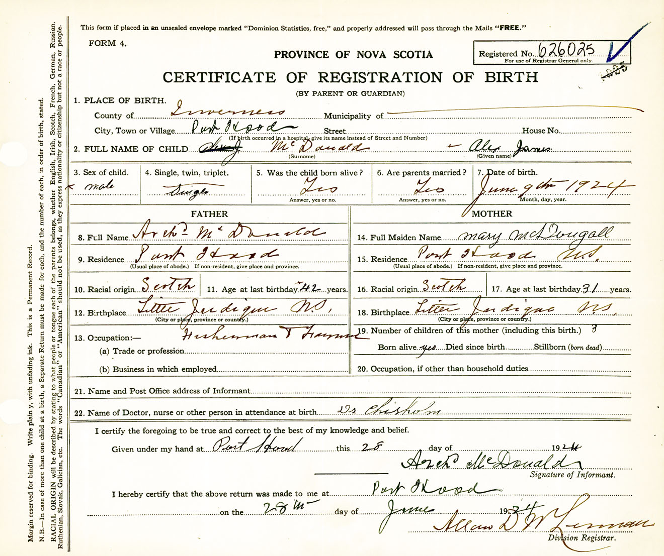 Male Birth Registration: Year: 1924 number: 62600025