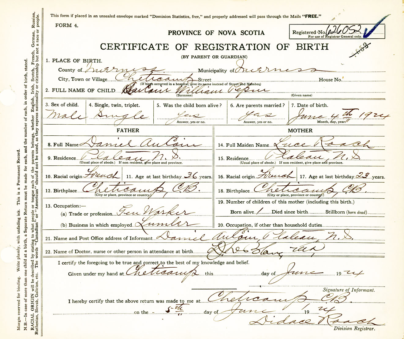 Male Birth Registration: Year: 1924 number: 62600052