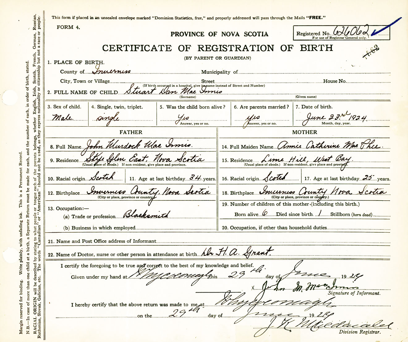 Male Birth Registration: Year: 1924 number: 62600062