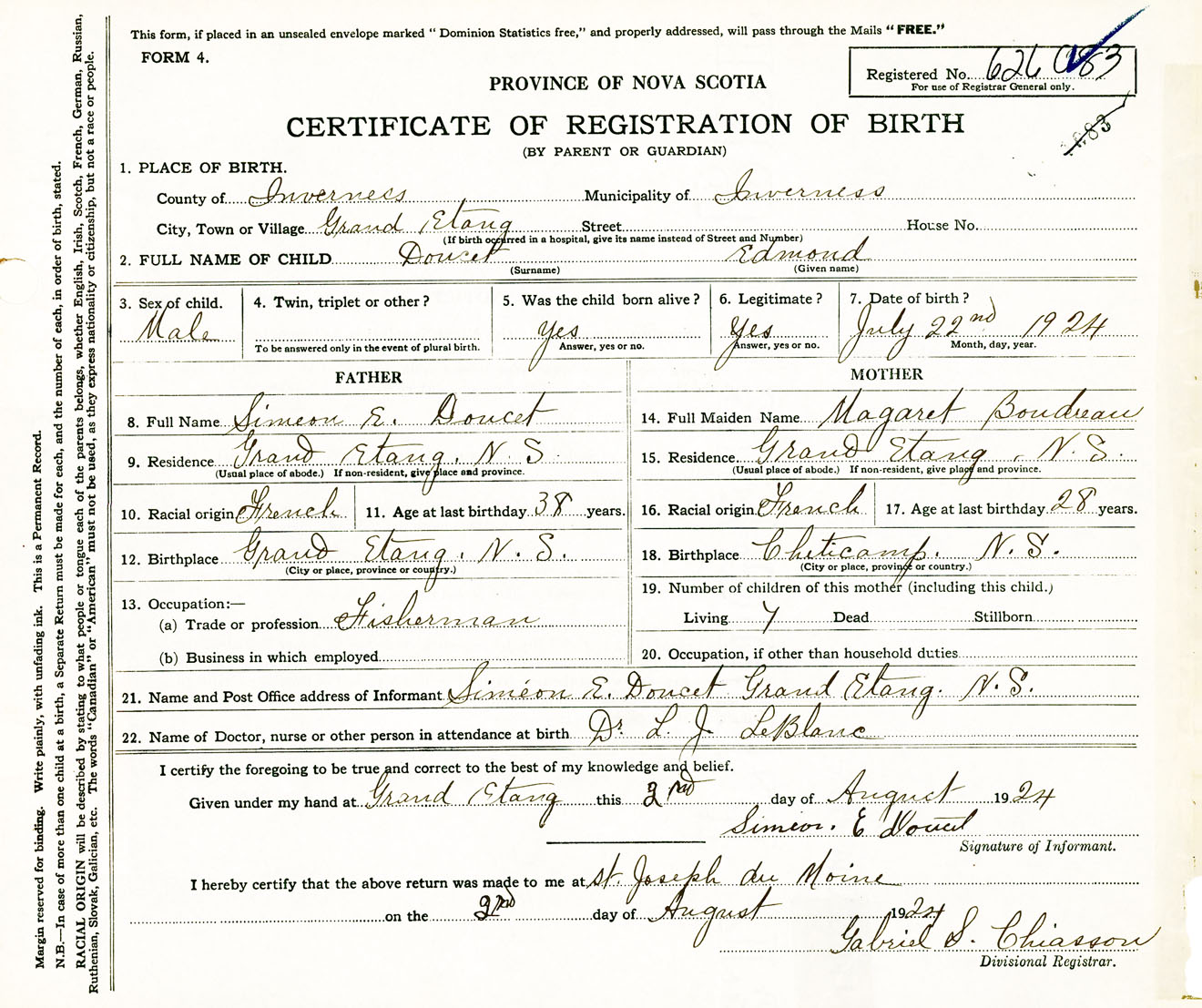 Male Birth Registration: Year: 1924 number: 62600083
