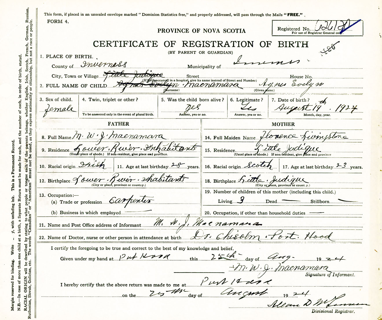 Female Birth Registration: Year: 1924 number: 62600120