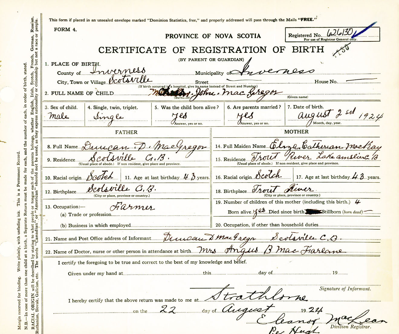 Male Birth Registration: Year: 1924 number: 62600130